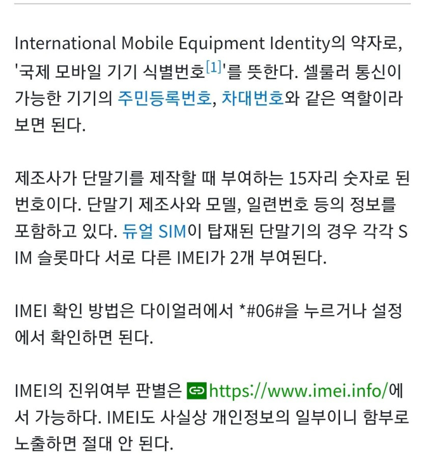 IMEI 번호는 개인 정보와 마찬가지로 중요한 정보이므로, 함부로 타인에게 노출하지 않는 것이 좋습니다.